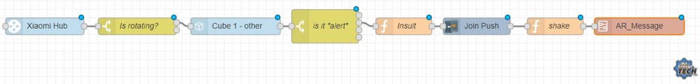 The massive advantage of NodeRED in oppose to the native MiHome application is the ability to switch the cube control schemes on the fly. You could can have the cube controlling the movie when the playback is detected and switch to other schemes by enabling and disabling the flows. One cube, plenty of applications. I will keep the Insult-o-tron 9000 just in case 🙂