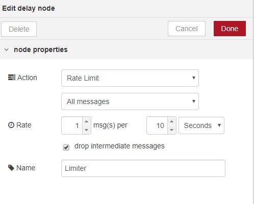 There is one more thing we have to do before the NodeRED and Amazon Dash integration is complete. If you add a debug node you will notice that sometimes the node fires multiple times. That’s not good! Fortunately, this is very easy to solve – just add a rate-limiting node, asking to discard anything within 10 sec of issuing a request.