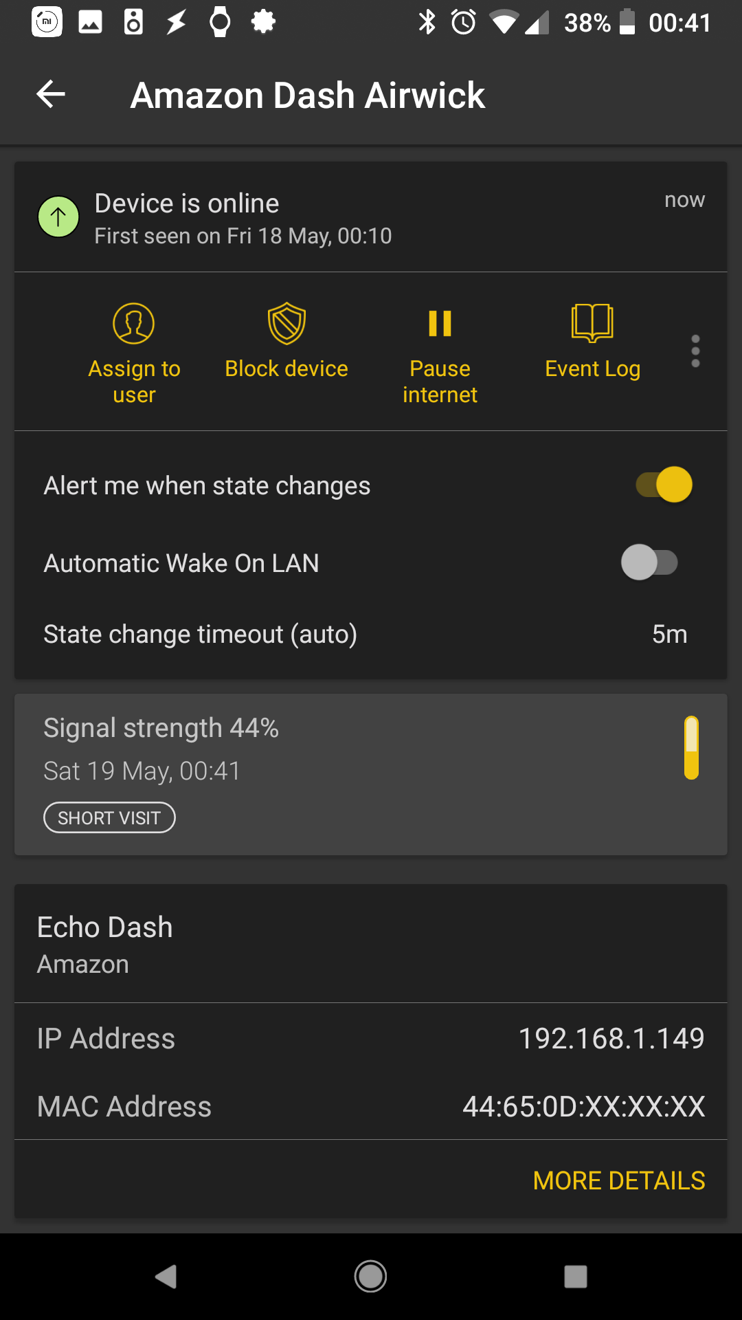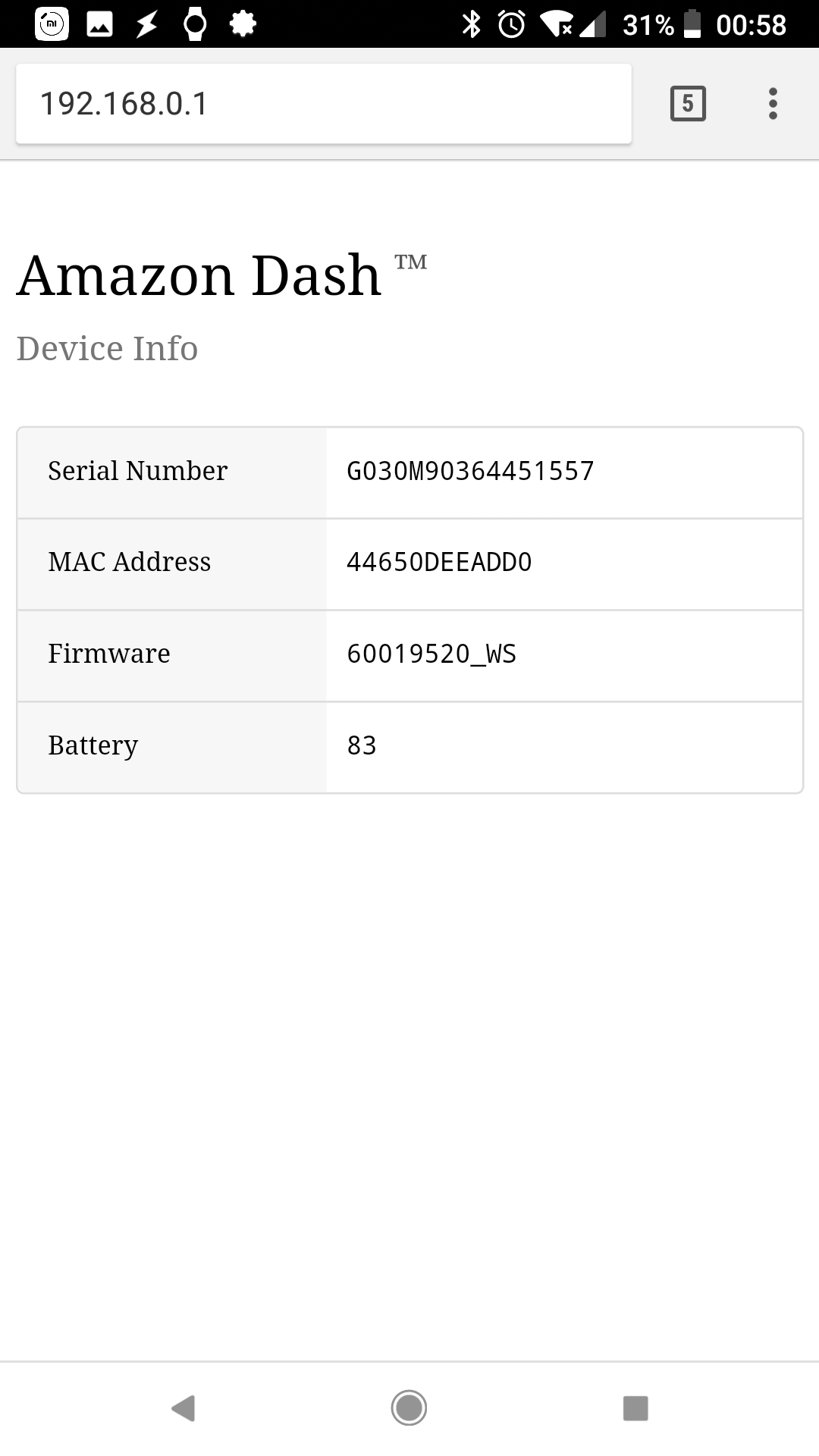 I was able to quickly copy the MAC addresses and name the buttons for my personal reference. If you don’t have the Fingbox, you can try the same with the Fing app just note the scan of the network has to be timed well. You can also check the router DHCP tables or fire up the python script from the Doorbell tutorial. The new buttons will also display the MAC address if you put it in the AP mode (hold the button for 6 sec, then look for the SSID Amazon ConfigureMe) – a handy setup page showing not only the MAC address but the battery level too!