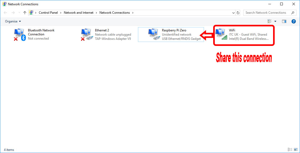 Navigate to the Windows Network connection tab. You will see your active internet connection and the Rasberry Pi Zero listed as “USB Ethernet/RNDIS” Make a note of the connection name (Raspberry Pi Zero).