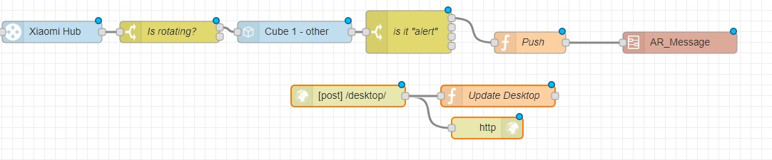 When I push the Aqara Cube, my PC changes the active desktop (Win+Ctrl+Left/Right). First, I have to keep track of which desktop is currently enabled. I used HTTP requests to update the NodeRED each time I change the desktop. I’m doing this so the NodeRED would know what is the active desktop (stored as flow variable) and send the correct instructions when the Cube is pushed.