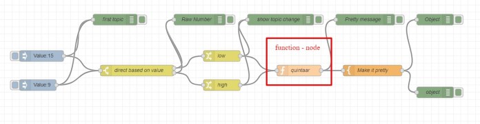 The payload will reach one of the change nodes. These will, in this example, assign a new topic to the payload. You will see that you can simply overwrite the value stored as the topic. As we are only going to change the topic (msg.topic), the payload will be moved over further unchanged. It’s important to know when the payload is modified.