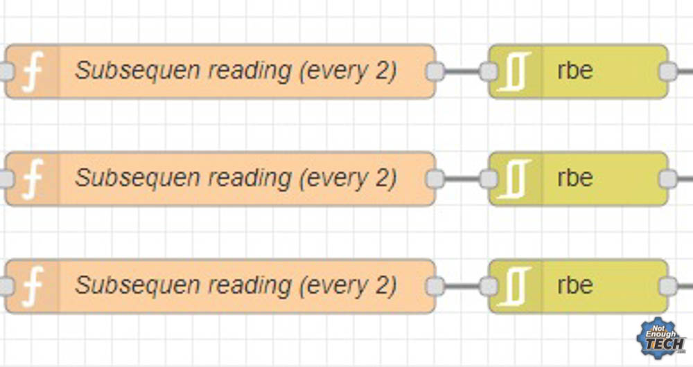 RBE node allows just that. It will drop all the messages unless the payload itself changes. After a couple of hours of testing, I noticed that from time to time I got short breaks when the target device became inactive. I don’t mind charts having short breaks, but notifications would be very annoying. I created a script that would only send every 3rd message providing that: