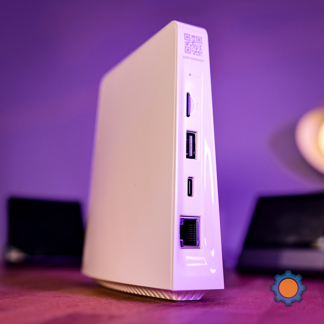 It resembles one of these awesome routers released by GL iNet. The white design features an RGB ambient light in the front, 4 interface buttons at the top and intriguing I/O at the back: micro SD card slot, USB-A, USB-C (power) and Ethernet (10/100). The box contains power and a short Ethernet lead. That’s about it.
