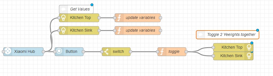 The most time-consuming task was to figure out how to dim lights using Xiaomi MiHome Switch in NodeRED. I had to overcome some limitations to combat the timeouts of the Yeelight node and create a dimmer that will recognise what I am trying to do. I settled for a dimmer that works like this:
