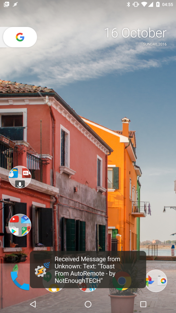 The messages that you can send between devices will be displayed as toast on the recipient’s end. The message can have files attached to it, be protected by password and have a specific time to live (TTL in sec). The message can be sent to a group or a single device. This messages can be used to trigger Tasker AutoRemote condition profiles.