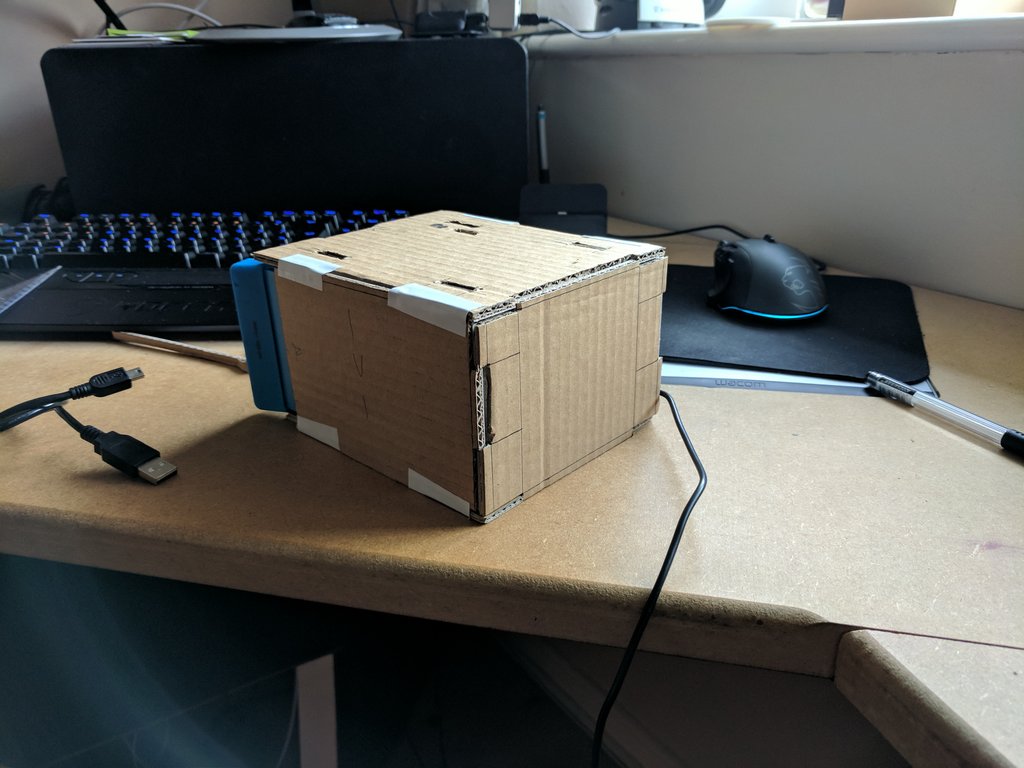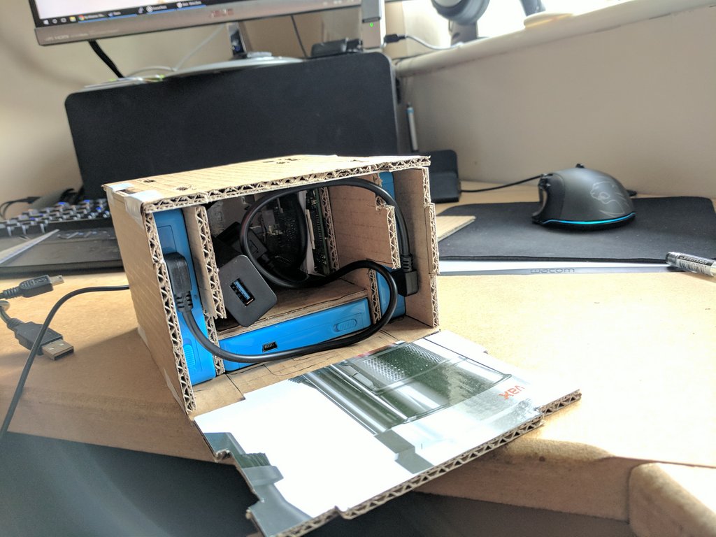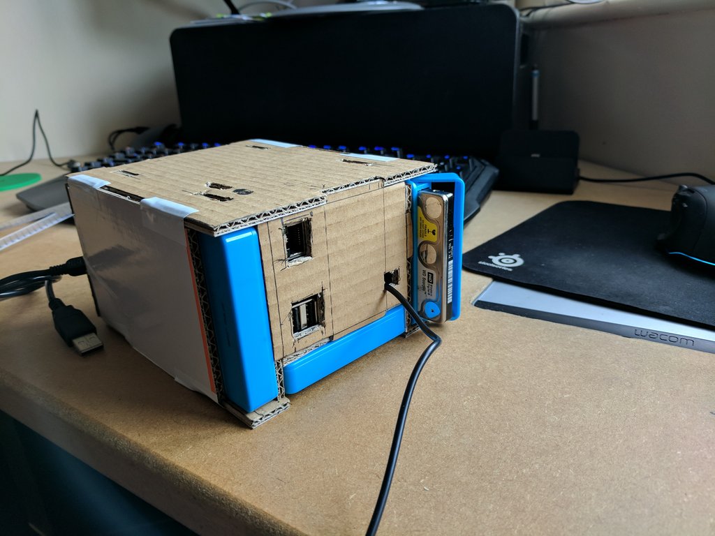 Everything is powered by a single power brick, so you don’t see any extra cables apart from the Ethernet one. This keeps the box nice and presentable. I mean the final perspex design, not the cardboard imitation with my markings on it.