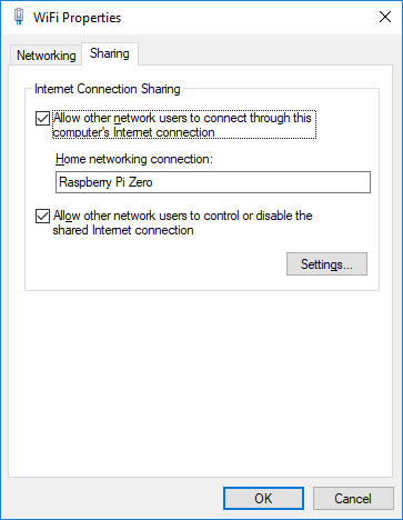 Select the active internet connection and use Right Click to access the properties. In the Share tab, share this network connection with… you guessed it the “USB Ethernet/RNDIS” device. Reboot your Raspberry Pi and enjoy the internet connectivity.