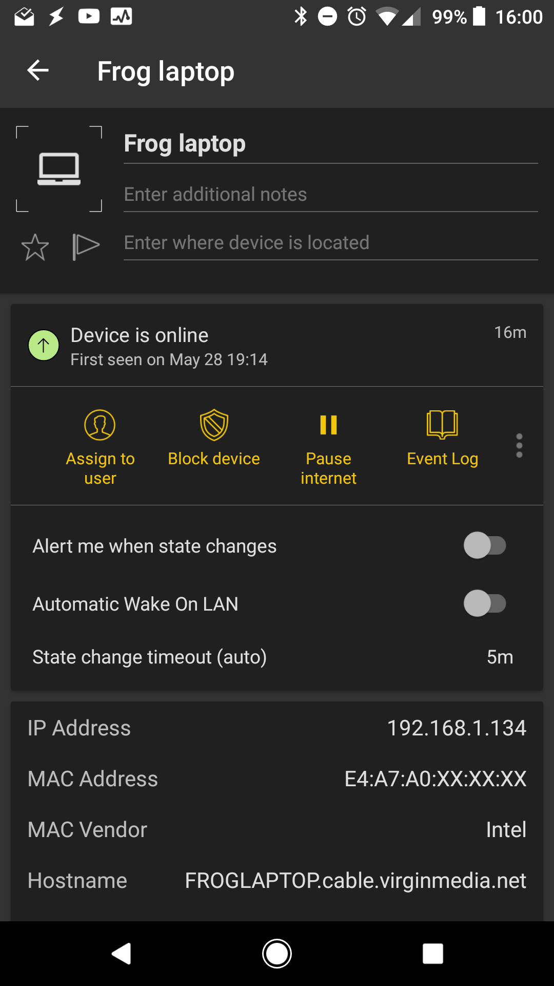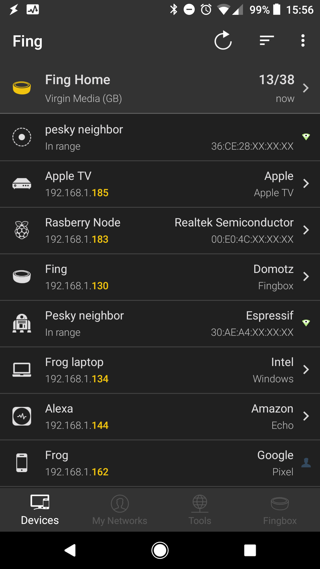 The same set of information is available from the Fing app, however, only using Fingbox this information is available to you outside of your local network. You can get the MAC addresses, view logs, block internet or simply check what devices are online. You will also get a notification (email/phone notification) when a new device is connected or you have set up a notification for a particular device.