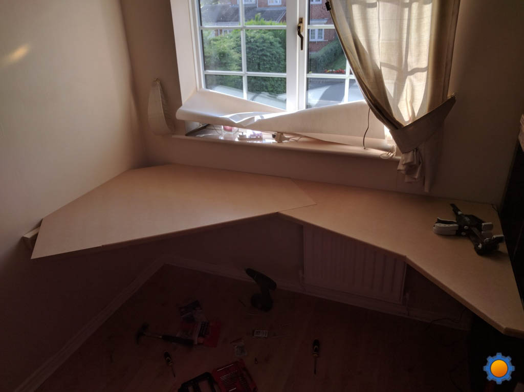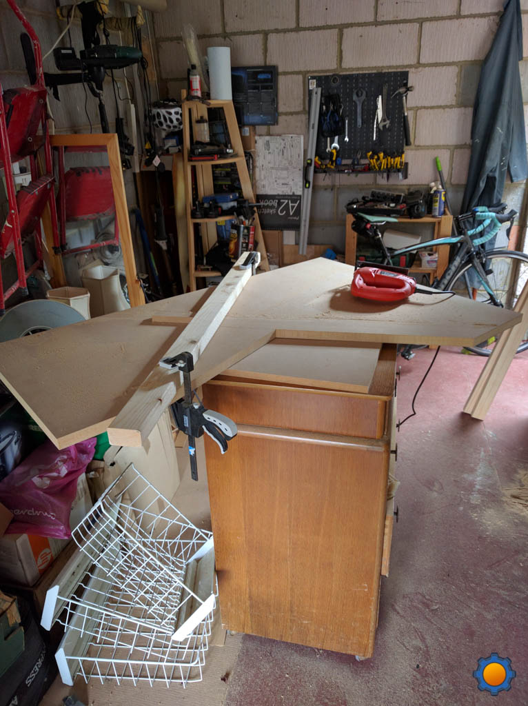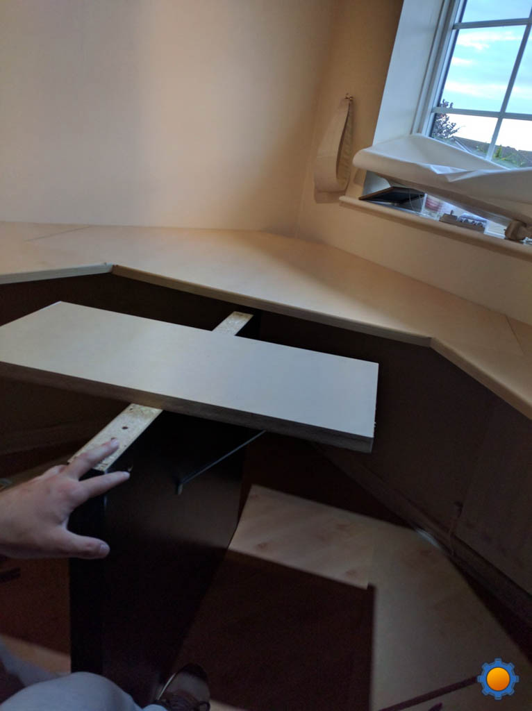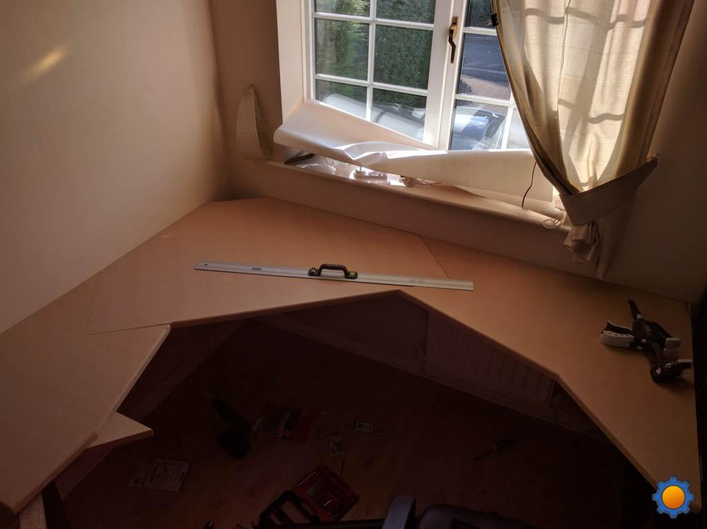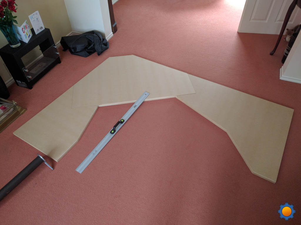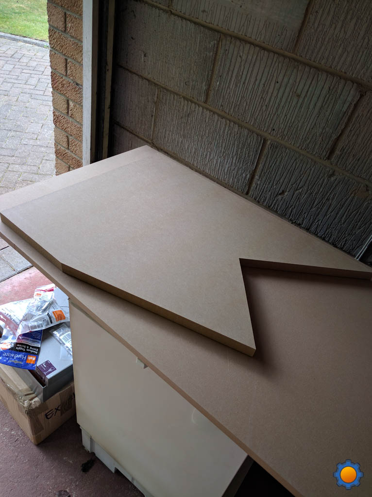 Cutting was a fairly uneventful affair. All straight lines, simply following made earlier pencil marks. My neighbour helped me with getting the corners rounded using a router, as I was running the risk of getting my fingers cut on the edges of the surfaces.